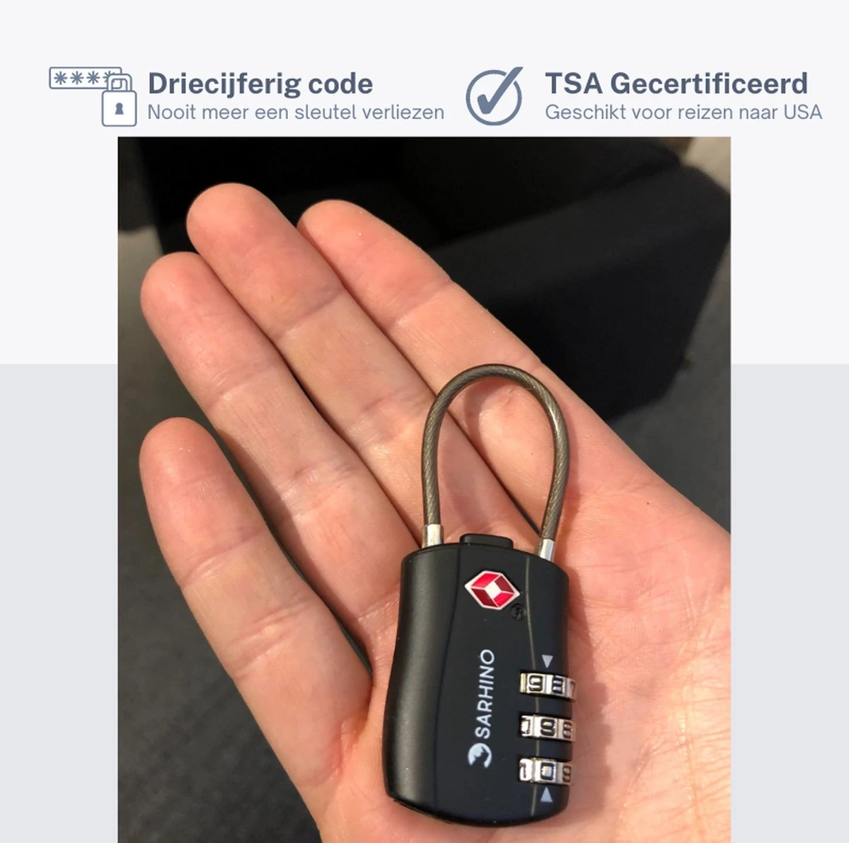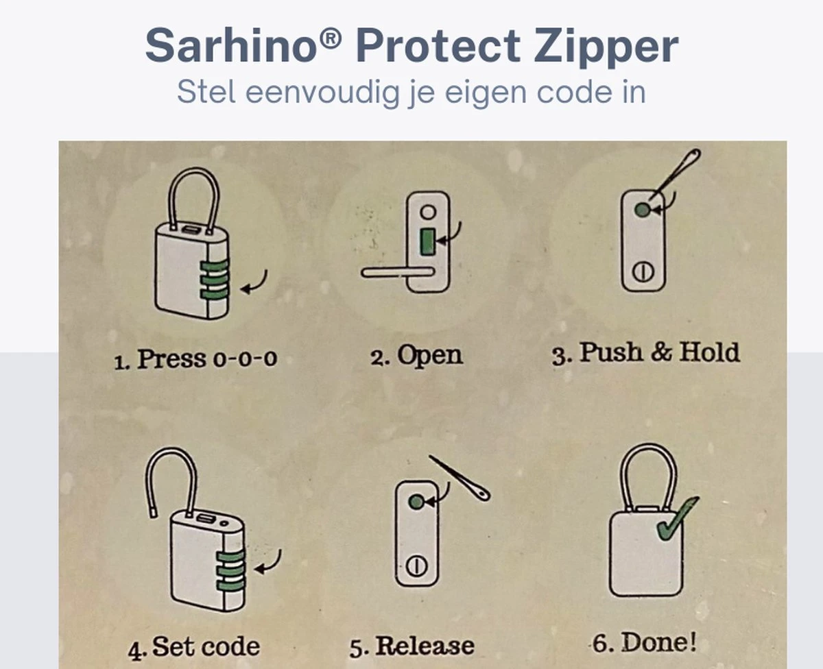 Dankzij het driecijferige codesysteem van het Sarhino Protect Zipper slot hoef jij je geen zorgen te maken over het kwijtraken van een sleuteltje. Je opent het slot eenvoudig met de persoonlijke driecijferige code, plaatst het slot door de ritssluiting en klikt hem op slot. Snel, simpel en veilig.
