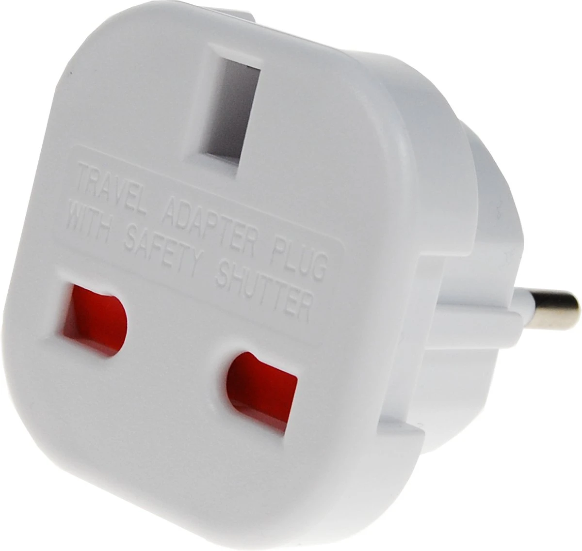 Reisstekker UK naar EU in een witte uitvoering ook wel een ’travel adapter’ genoemt. De stekker kan gebruikt worden om een UK stekker middels adapter in een EU stopcontact te gebruiken. Op de stekker zijn ook rode safety shutters aanwezig en heeft een CE keurmerk
