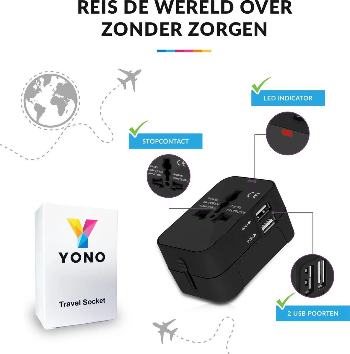 Bestel vandaag nog uw wereldstekker met 2 USB poorten van het merk YONO inclusief 2 jaar garantie en gebruik hem in meer dan 160 landen