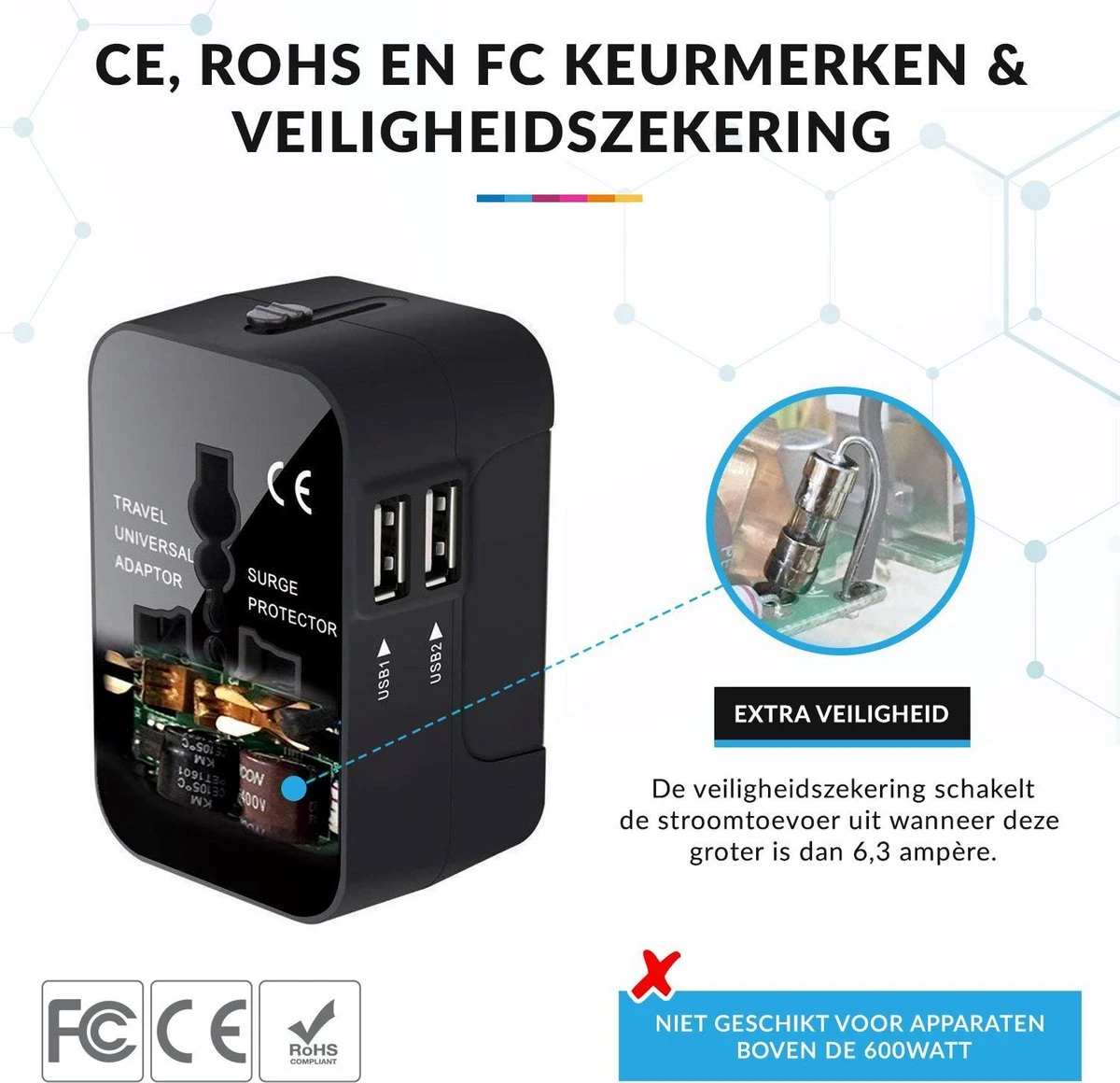 De wereldstekker is volledig gekeurd volgens Europese kwaliteitsnormen en goedgekeurd volgens de CE, FC en RoHs keurmerken.. In de universele reisstekker is een veiligheidszekering ingebouwd die bescherming biedt tegen overladen. De veiligheidszekering schakelt de stroomtoevoer uit wanneer deze groter is dan 6,3 ampère, waardoor het apparaat niet overhit raakt. Kortom, deze reisstekker is gebruiksvriendelijk en is veilig in gebruik. Let op, de reisadapter is niet geschikt voor apparaten boven de 600watt