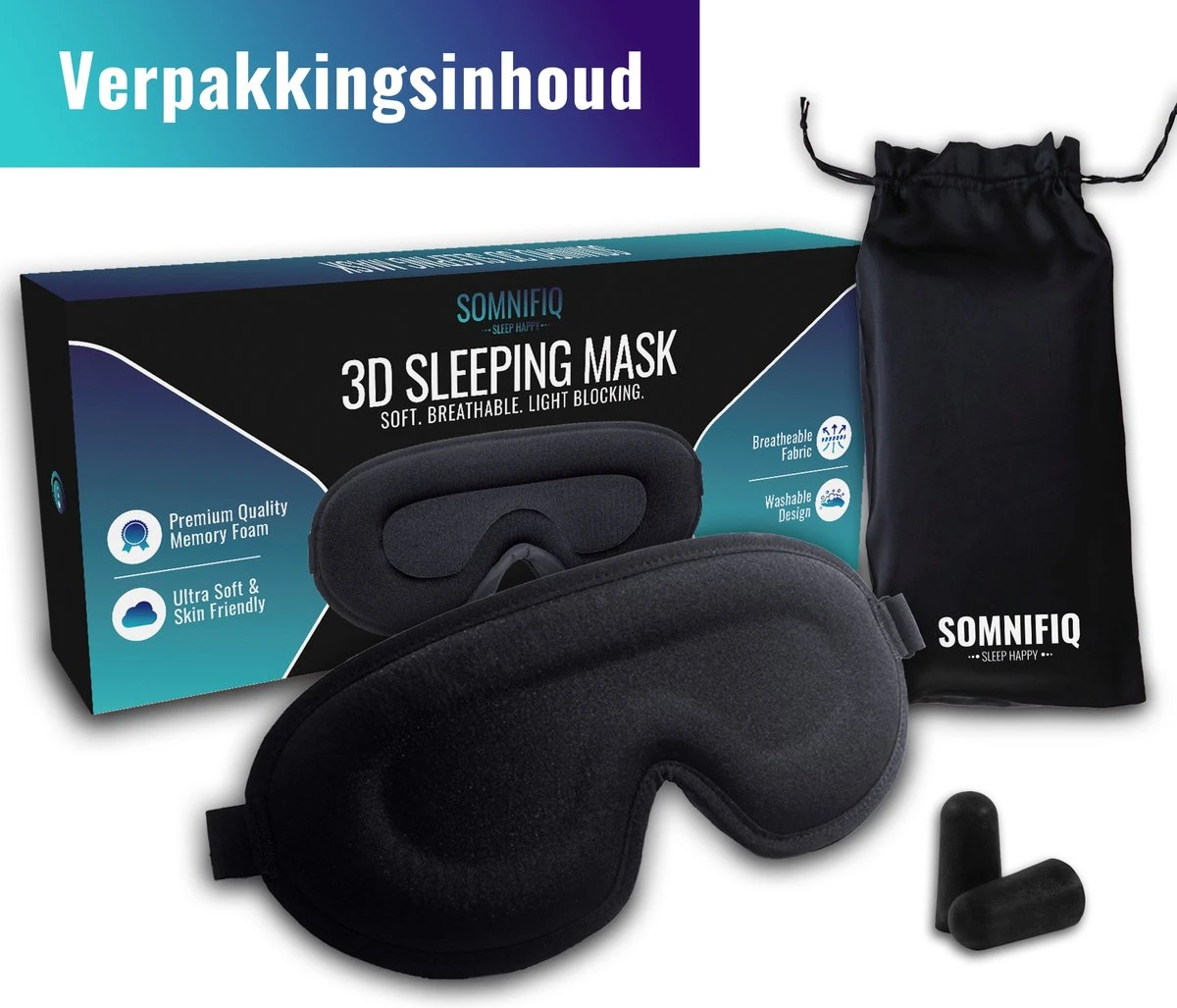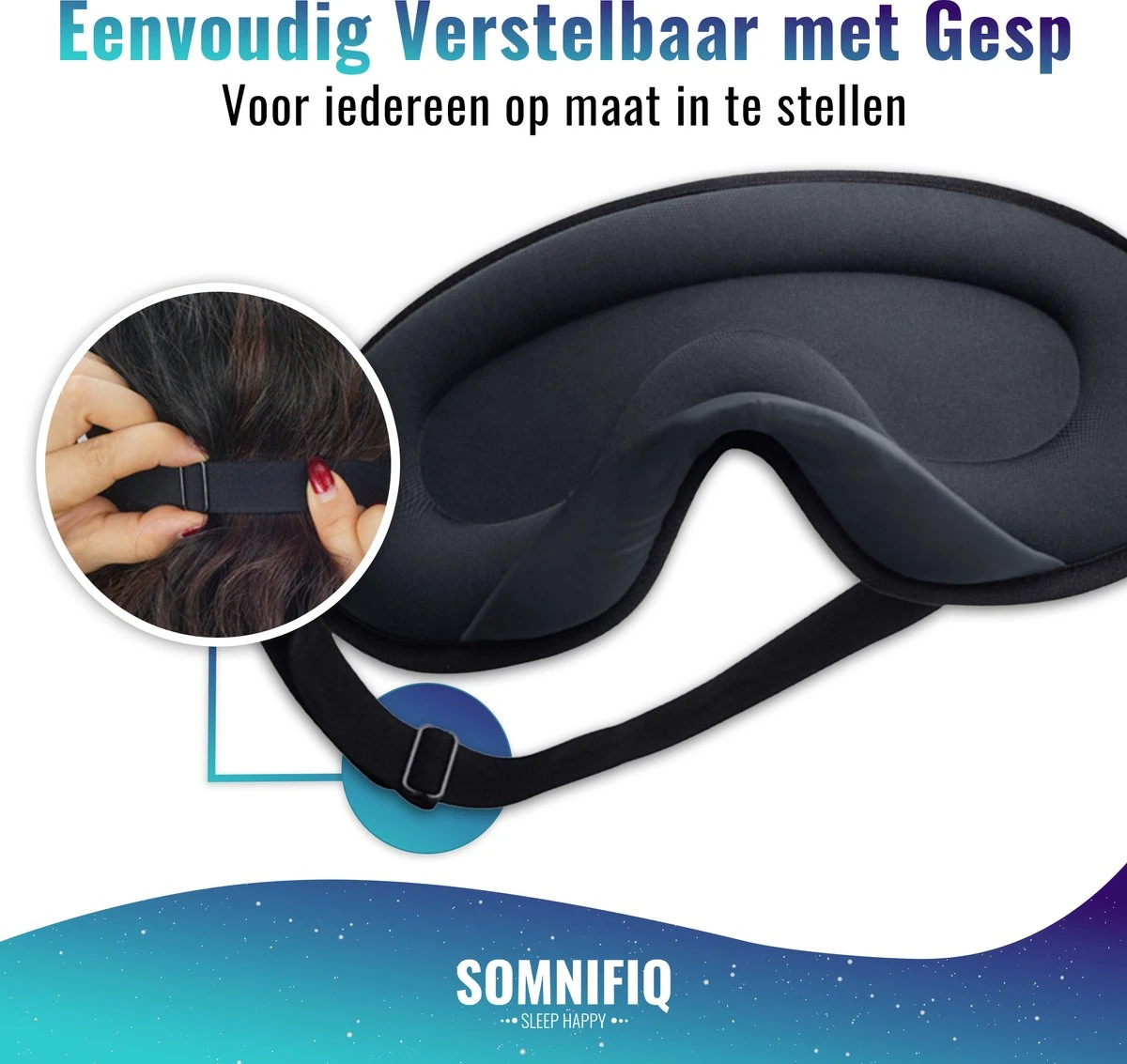 Wie wil er nu niet heerlijk uitgerust wakker worden?! Een goede nachtrust zorgt voor veel gezondheidsvoordelen. Bovendien is een uitgerust mens gewoon gelukkiger. Twee belangrijke factoren die een goede nachtrust bevorderen zijn duisternis en stilte. Het Somnifiq 3D slaapmasker inclusief oordopjes komt hier dus goed bij van pas. Het 3D slaapmasker heeft een uniek ontwerp met maar รฉรฉn gat voor beide ogen. Dit zorgt voor optimaal comfort tijdens het slapen en voorkomt druk op je ogen en wimpers. De combinatie van traagschuim en zijde zorgen voor een heerlijk zacht slaapmasker, zo licht als een veertje (37gr) en 100% verduisterend. De verstelbare gesp zorgt ervoor dat het masker voor iedereen een comfortabele pasvorm kan aannemen. En geen zorgen over haarbreuk want we gebruiken geen klittenband in ons ontwerp!