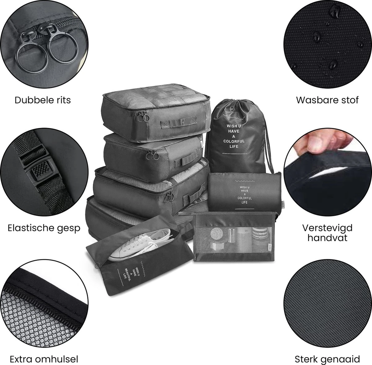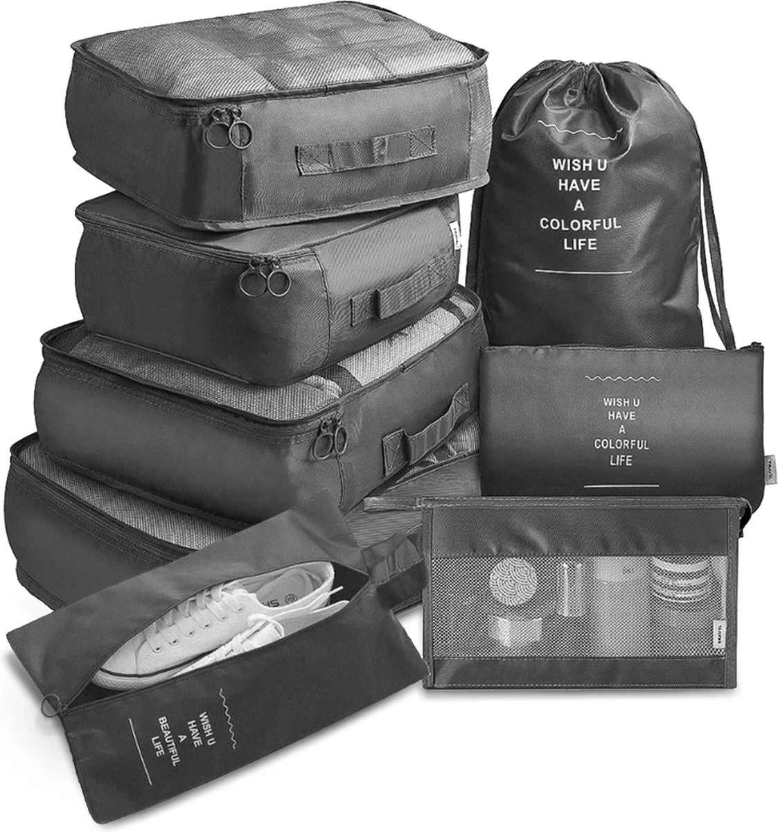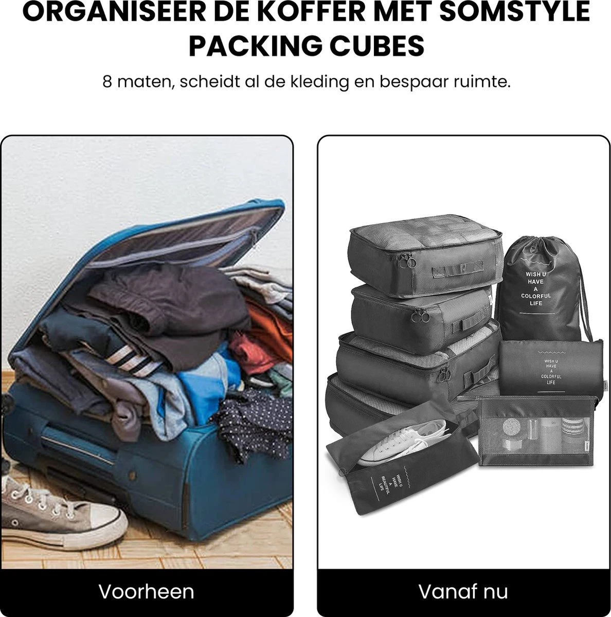 De 8-delig packing cubes set van Somstyle bestaat uit