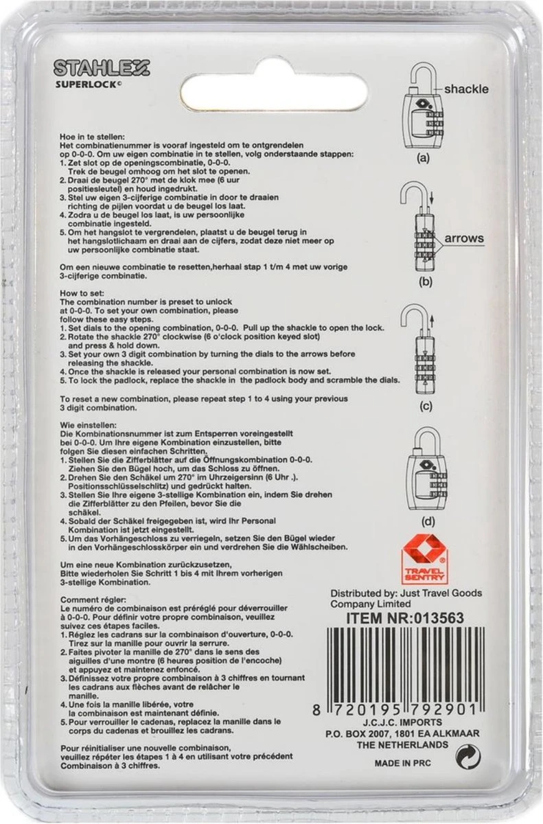 Robuuste impactbestendig polymeerlichaam met verchroomd massief stalen schakel. Instelbare 3-cijferige combinatieslot. Beveiligt reisbagage inclusief rugzakken en aktetassen. TSA® gelicentieerd voor luchthaven- en douane-inspectie. Toegang tot bagage mogelijk zonder het slot te beschadigen