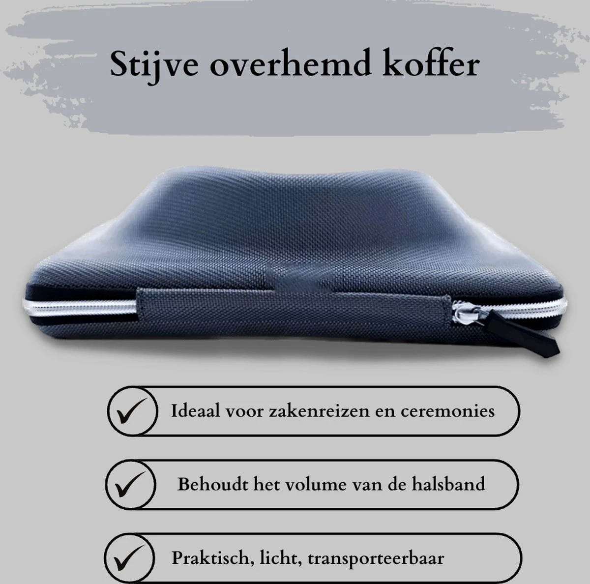 Onze unieke overhemdendoos biedt de ultieme bescherming voor uw overhemden tijdens het reizen. Of het nu gaat om een volle koffer, rugzak of zelfs een fietstas, deze harde en stevige hoes is de enige oplossing die uw overhemd echt kan beschermen. De speciale vorm biedt bescherming voor de kraag en het unieke, bilaterale systeem beschermt de randen van uw overhemd tegen kreukels. Ons ontwerp is van ongeëvenaarde kwaliteit en maakt deze overhemdendoos een perfect cadeau voor mannen die al elk soort gadget bezitten. De waterafstotende nylon oppervlakte, EVA schuimversterking en zachte velvet binnenvoering maken onze overhemdendoos van premium materialen. Bovendien is het ideaal om mee te nemen dankzij het licht gewicht en past het gemakkelijk in rugzakken, trolleys en zelfs fietstassen. Of u nu vaak reist voor zaken, regelmatig pendelt naar uw werk of gewoon een stijlvolle uitstraling wilt behouden tijdens speciale gelegenheden, onze unieke overhemdendoos is de perfecte oplossing voor u. Onze stijlvolle en moderne ontwerp, premium materialen en unieke beschermingsfuncties zorgen ervoor dat u er altijd professioneel uitziet, terwijl u uw overhemden beschermt tegen kreukels en beschadiging.