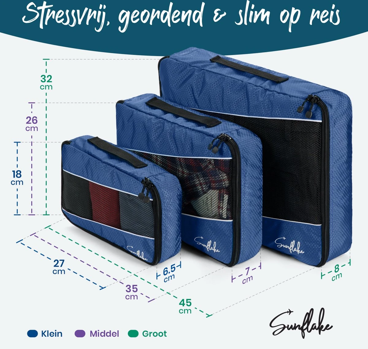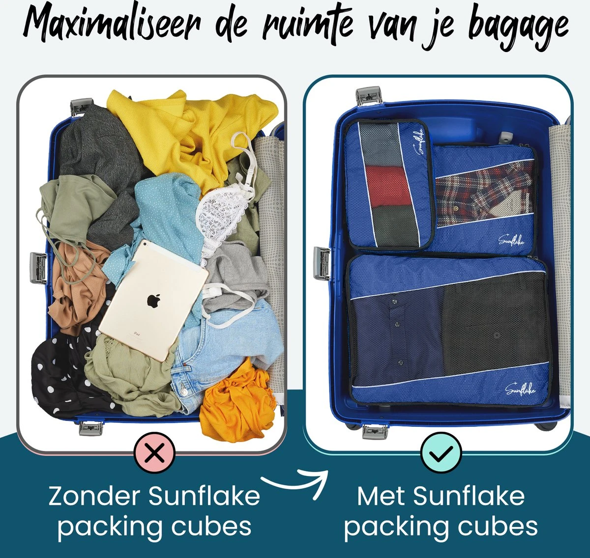 De absolute must-have voor reizigers: Sunflake packing cubes. Ze beschermen je kleding tegen kreuken, houden je koffer of backpack georganiseerd en je kan ook nog eens meer kleding mee nemen! Ontdek het gemak en ga stressvrij op reis.