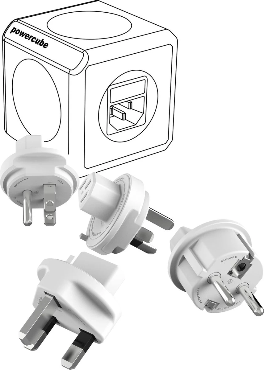 allocacoc ReWirable Travel Plugs, Reisstekker voor DE/FR, UK, USA, AUS. Kit bestaande uit 4 reisadapters DE/FR, UK, USA, AUS, alleen te gebruiken in combinatie met PowerCube Rewirable (EAN 8718444081821 en EAN 8718444081838).