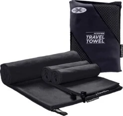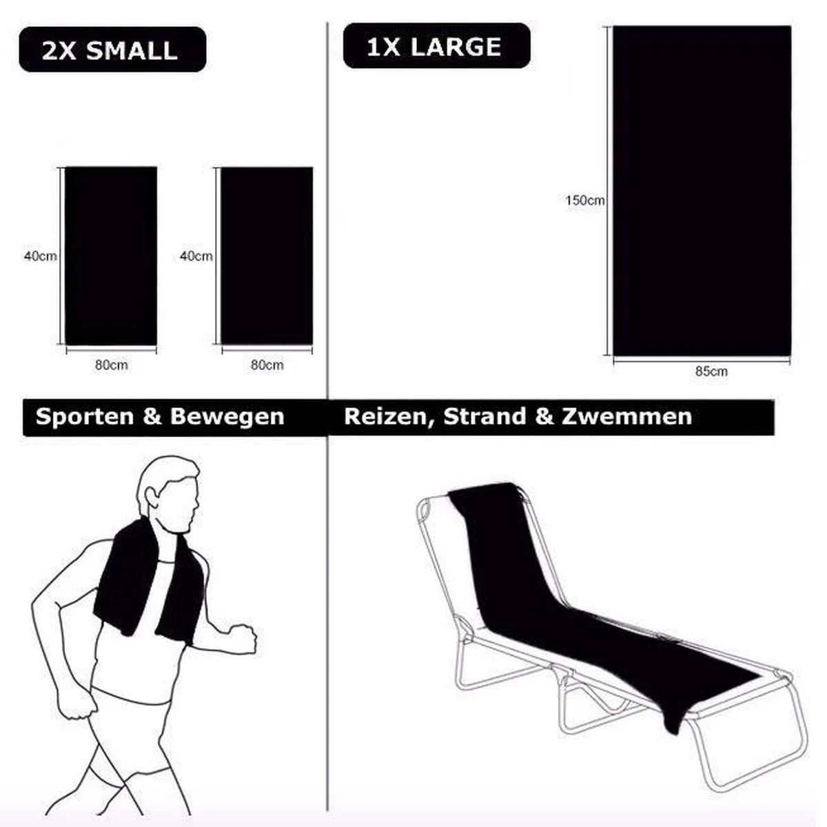 De set bestaat uit 1x Microvezel handdoek Large (85 x 150 cm) en 2x Microvezel handdoek Small (40 x 80 cm).