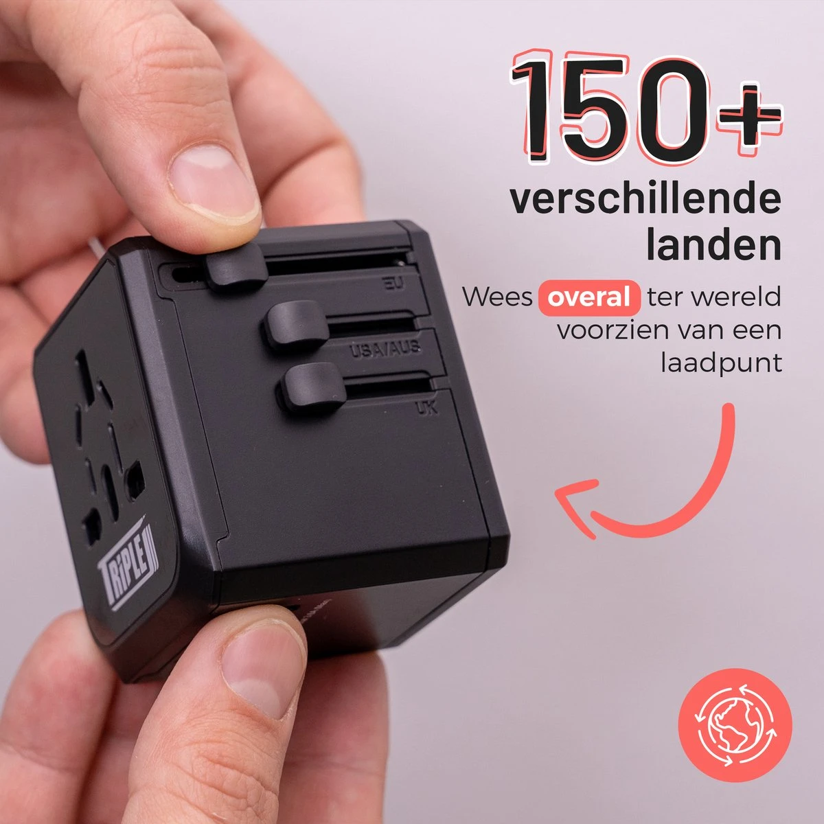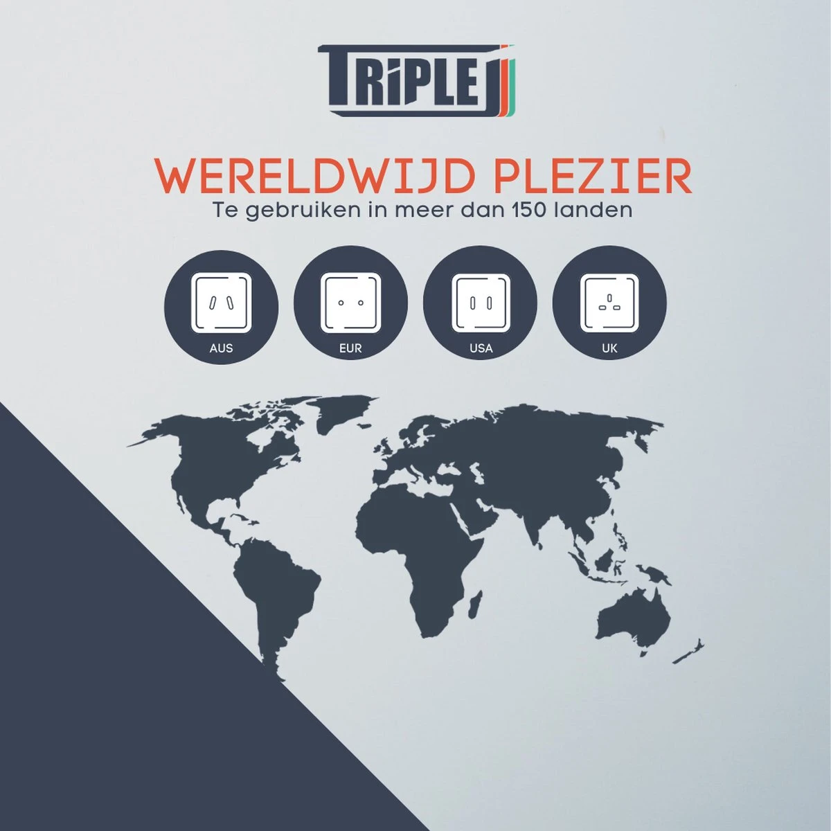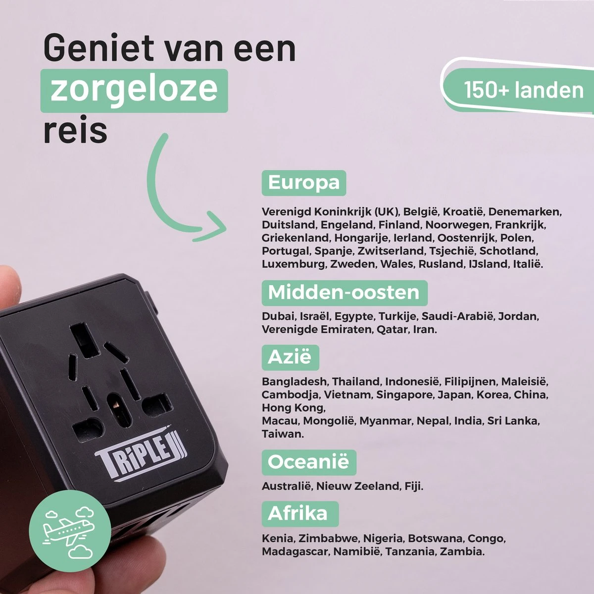 Wil je onbezorgd op vakantie gaan en zorgeloos van je nieuwe reisavontuur genieten? Bestel dan direct de universele wereldstekker van Triple Jยฎ en gebruik hem in maar liefst 150+ verschillende landen!