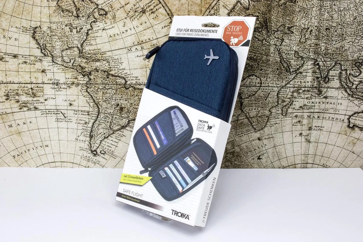 SAFE FLIGHT heeft alles wat u van een slimme documentenmap mag verwachten: 12 binnenvakken voor reisdocumenten, een penlus en de rits die rondom loopt. SAFE FLIGHT toont echter zijn ware kleuren wanneer het kwaad dichterbij komt. RFID-betaalpassen en creditcards worden beschermd met TROIKA DATASAFE voordat ze worden gelezen. Heb een goede vlucht!