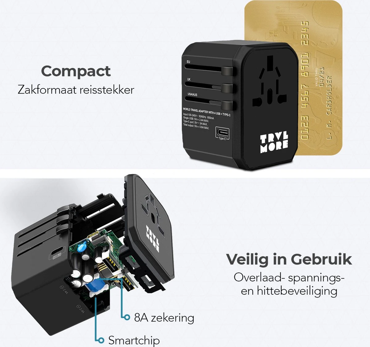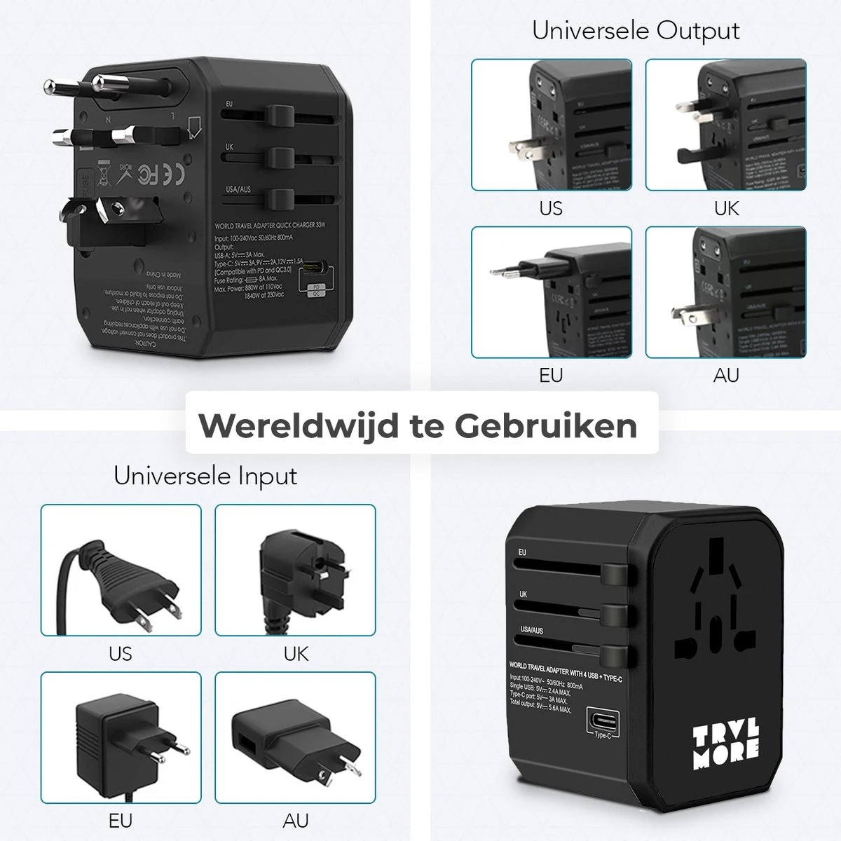 Deze zeer geavanceerde universele wereldstekker van TRVLMORE beschikt over de allernieuwste technologie en is in de meeste landen ter wereld te gebruiken! De wereldstekker is uitgerust met vier razendsnelle USB-A poorten en een USB-C poort, hiermee kun je vrijwel al je apparaten gebruiken of opladen. Dit tot wel zes apparaten tegelijkertijd! Tevens is de stekker geschikt voor apparaten met een hoger wattage en beschikt over meerdere veiligheidsfuncties. Kortom; de perfecte wereldstekker dus!
