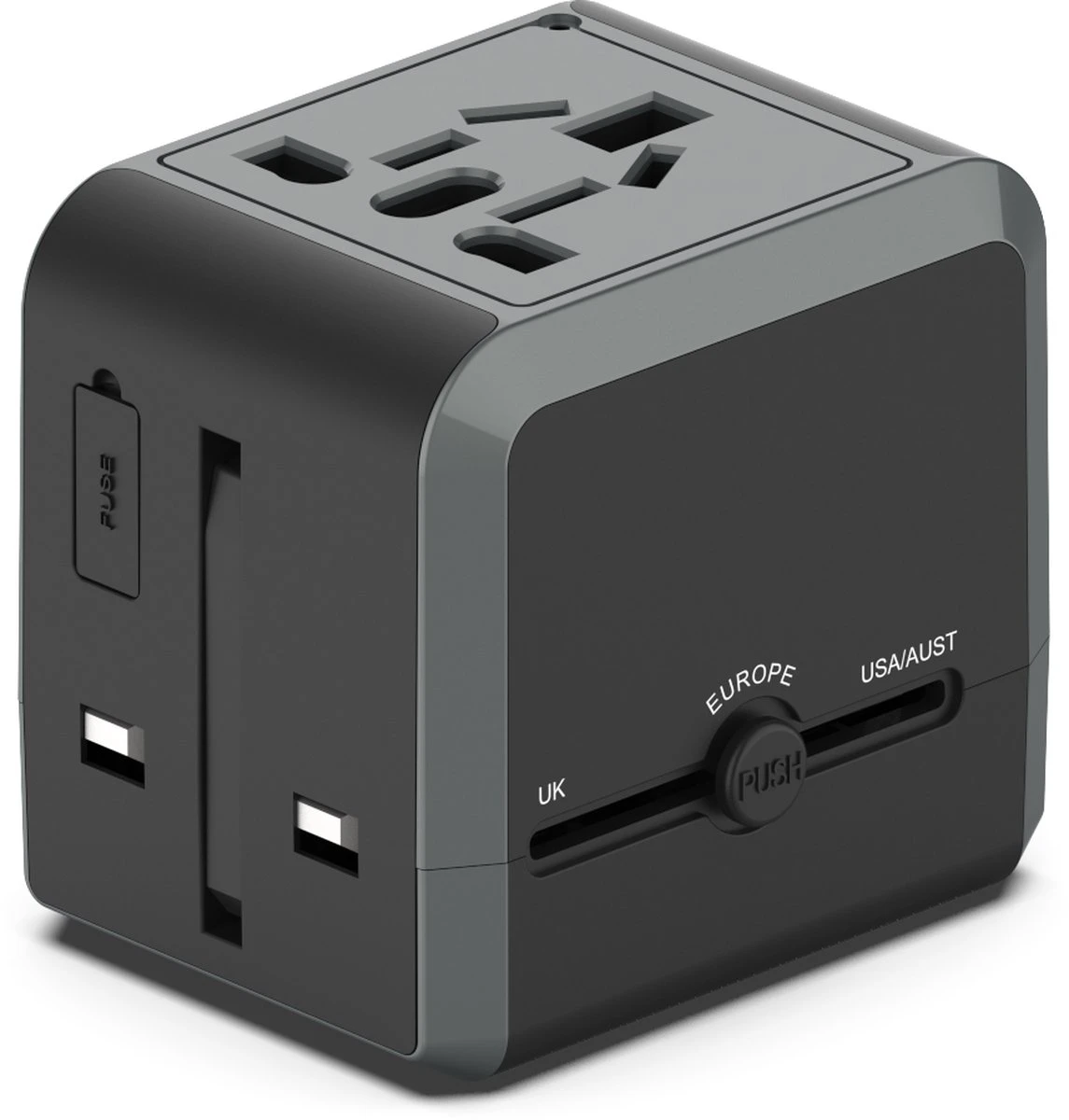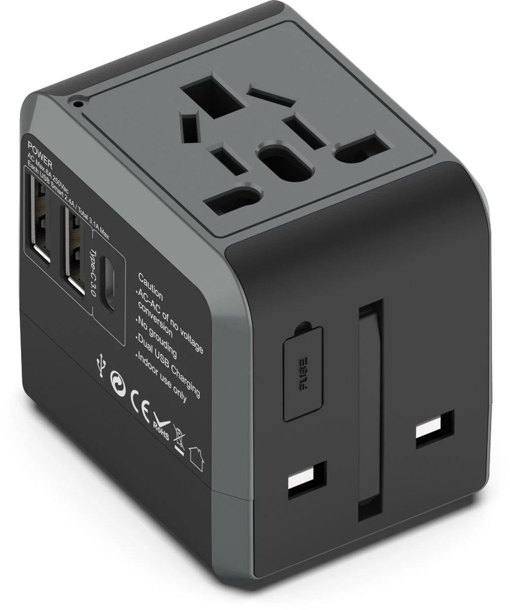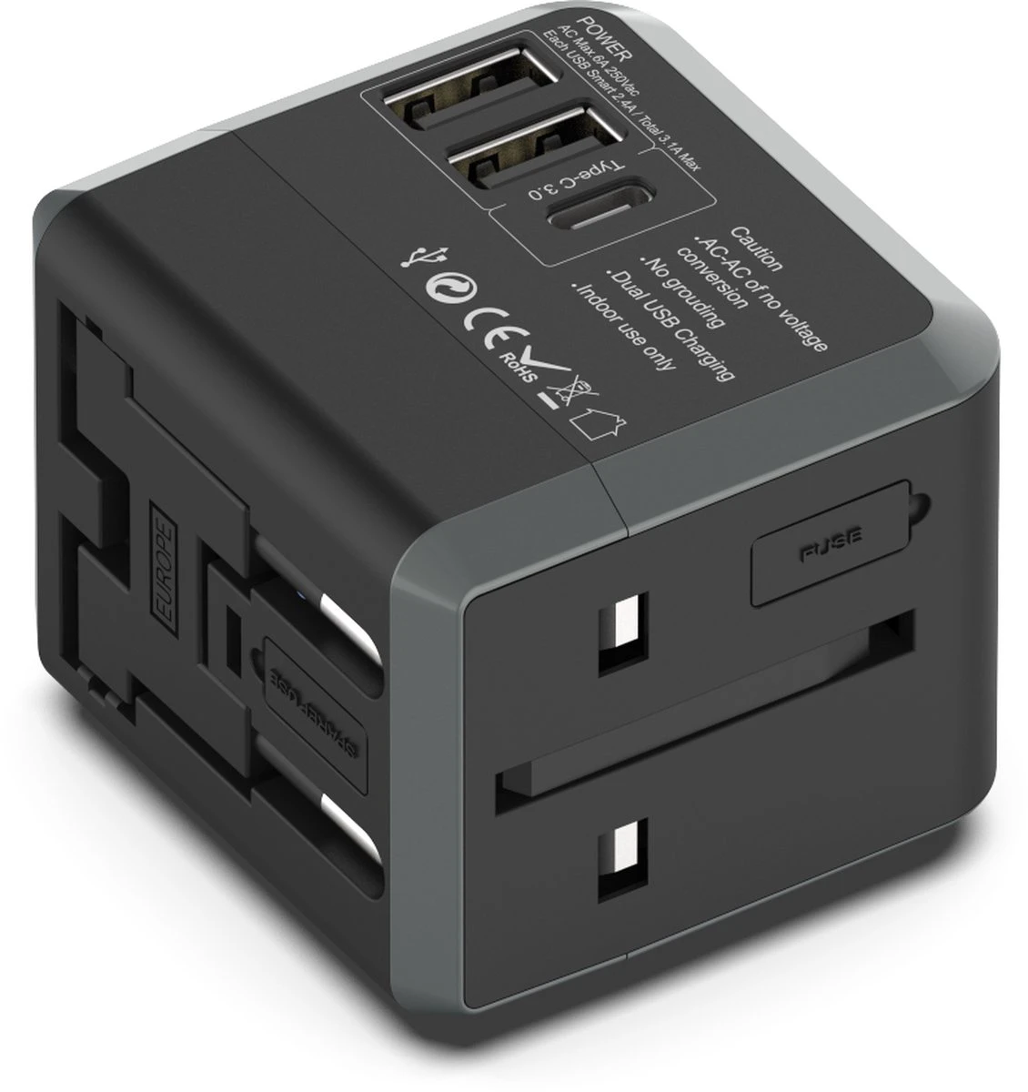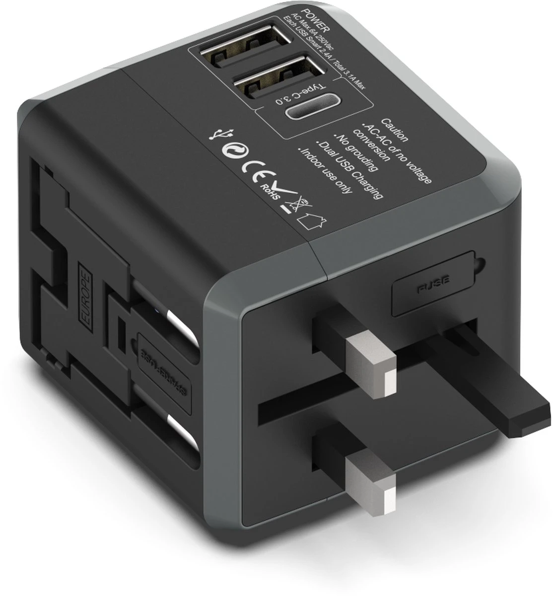 universele reisadapter met één USB C- en twee USB A-poorten. De adapter maakt gelijktijdig gebruik van het AC-stopcontact en de dubbele USB-poorten mogelijk. 1 USB C-poort en 2 USB A vormen samen een zeer draagbare oplaadoptie. USB C is de toekomstbestendige standaard die snelheid en veiligheid biedt, met de omkeerbare stekker die er elke keer als eerste in gaat. Ingebouwde zekering beschermen & Ingebouwde reservezekering en LED-stroomindicator.