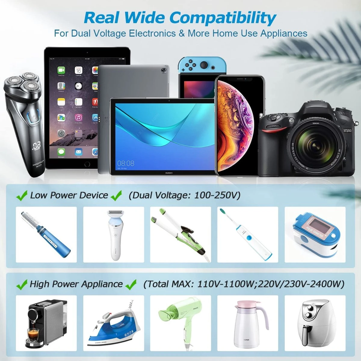 Functies en dingen om te weten Onze universele voedingsadapter ondersteunt in totaal 5,1 A / elke USB 2,4 A; voor zowel 50/60 Hz, 100-250 V AC; 1100W maximaal totaal vermogen bij gebruik in 110V-landen; totaal maximaal vermogen 2400W bij gebruik in 220V/230V-landen Belangrijke voorzorgsmaatregelen: โ Dit is geen omvormer, alleen een adapter voor apparaten met twee spanningen, het kan geen spanning omzetten. โก Gelieve niet te gebruiken voor apparaten die een aardverbinding vereisen. ใWe willen je geen ongemak bezorgen, controleer dit voordat je koopt