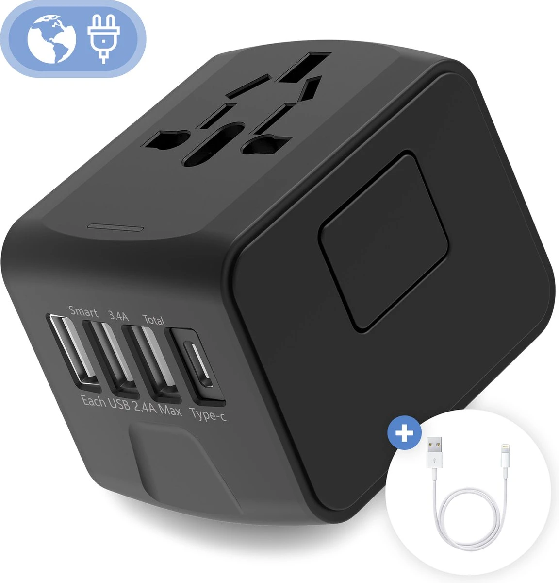 De Universele Wereldstekker van Flossy beschikt maarliefst over vier USB poorten. Drie hiervan zijn de standaard USB-A ingangen en รฉรฉn USB-C ingang. Zo heb je genoeg plek voor al jouw devices. Ook kun je natuurlijk รฉรฉn normale stekker in de adapter pluggen. In totaal kun je tot wel vijf apparaten tegelijk opladen!