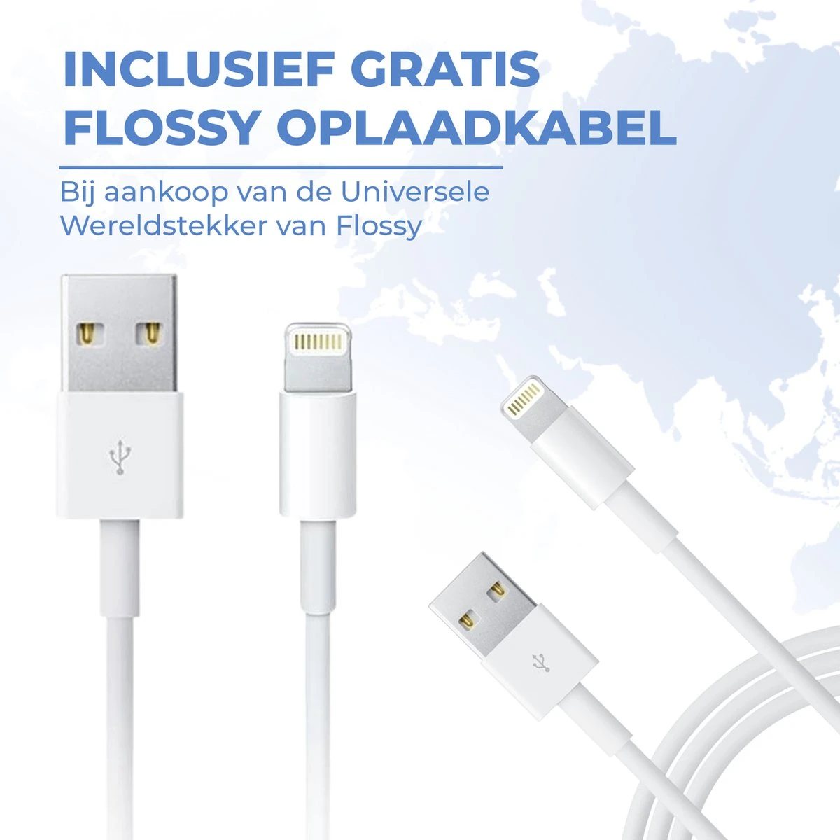 Bij de Universele Wereldstekker van Flossy krijg jij รฉรฉn gratis oplaadkabel cadeau!