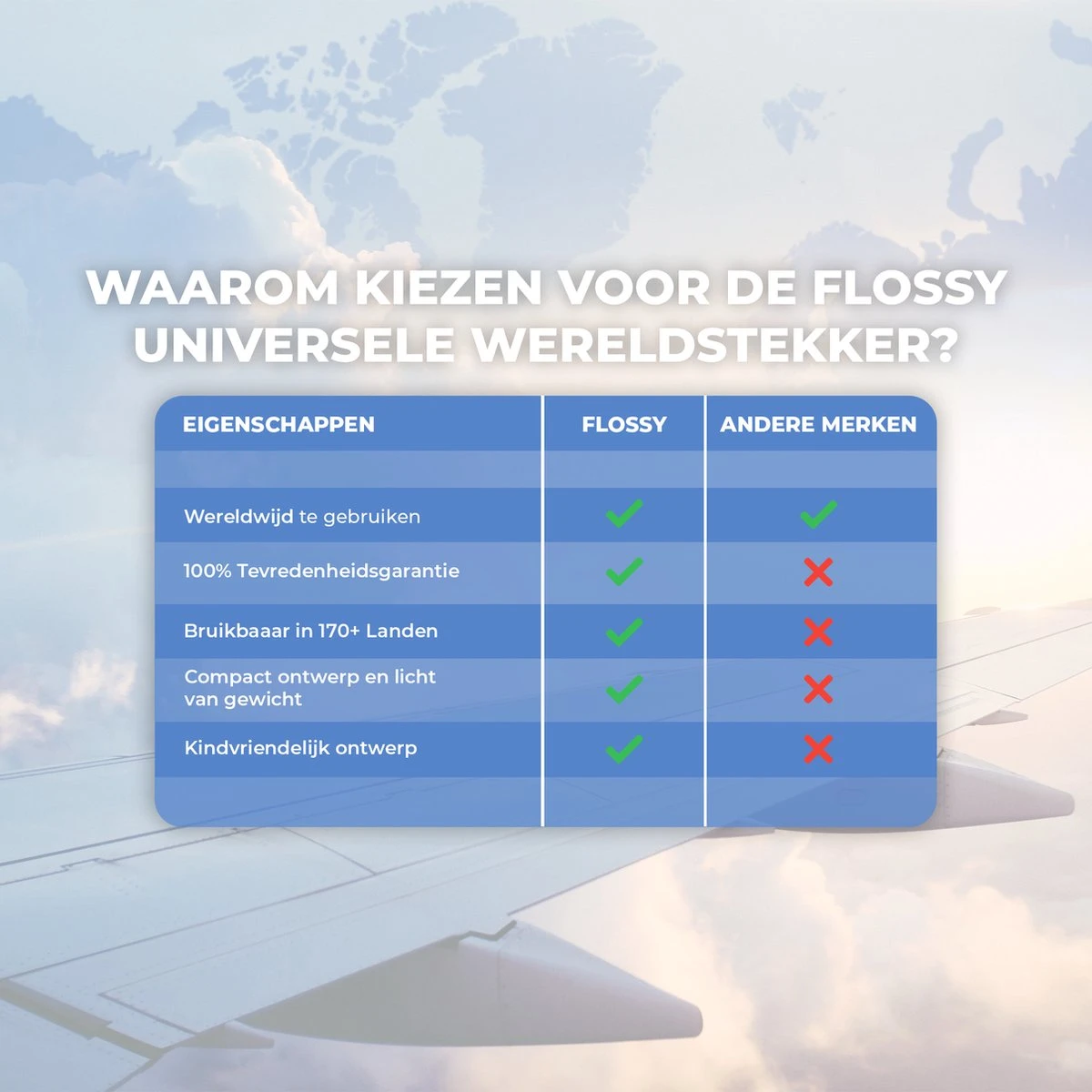 De Universele Wereldstekker van Flossy is compact vorm gegeven! Het ideale formaat om mee te nemen op reis. Wij hebben hem ook extra licht van gewicht gemaakt. Ideaal voor op reis dus!