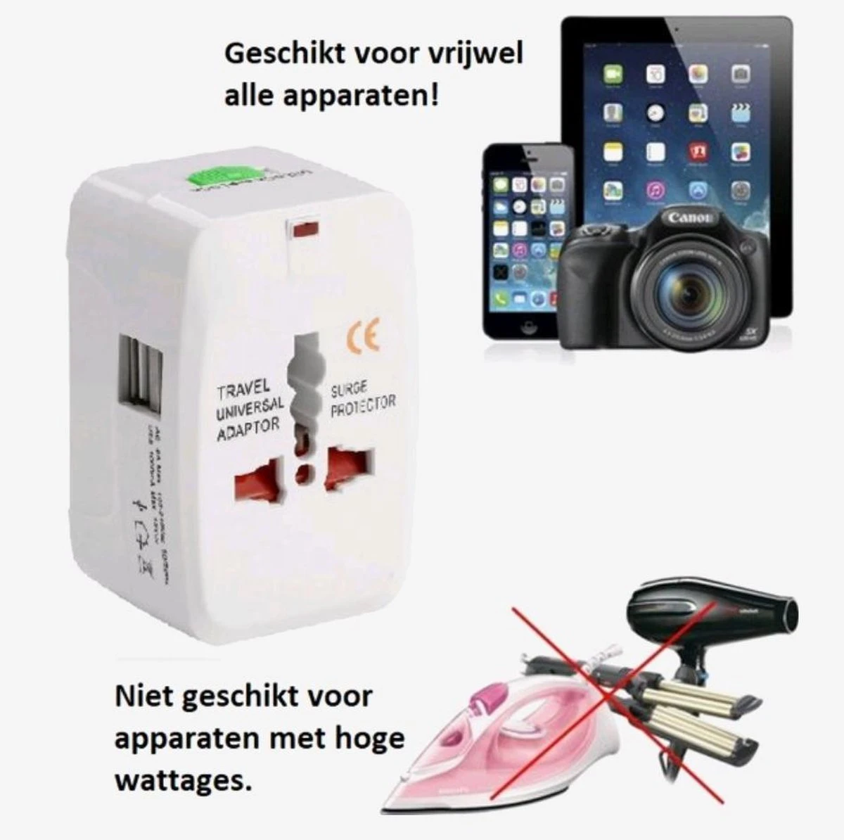 Deze universele wereldstekker heeft 2 handige USB poorten om je telefoons, tablets en andere apparaten met USB poorten op te laden. Het mooie van deze wereldstekker is dat hij te gebruiken is in 150 landen. Hij wordt geleverd in een handig opbergtasje en is zo ideaal om mee te nemen.