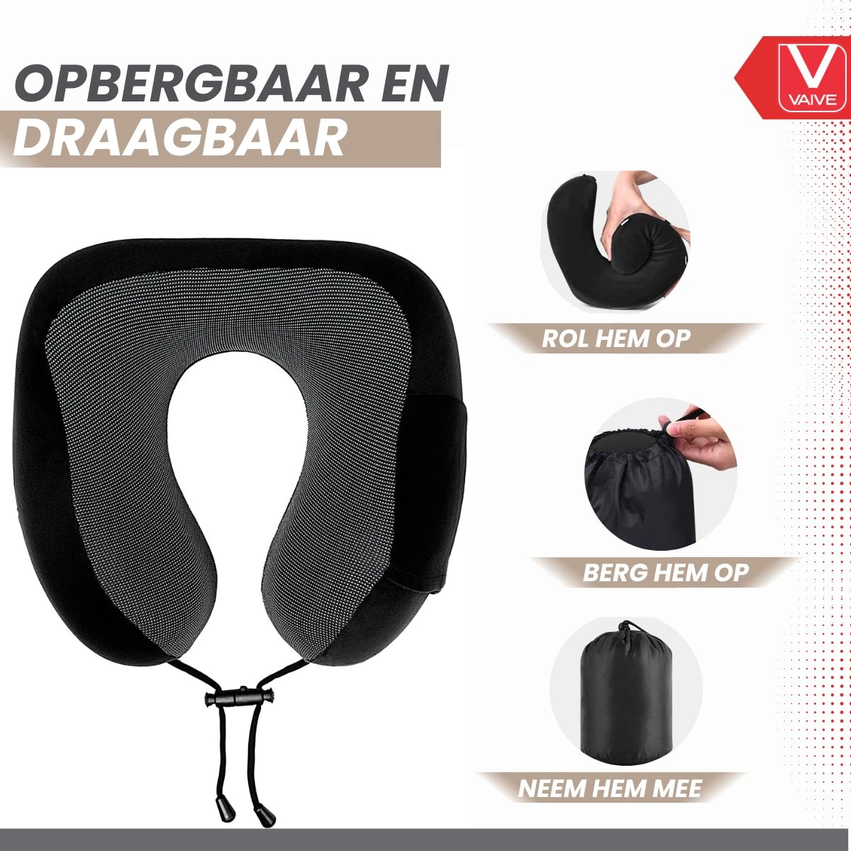 De reiskussen is naast comfort ook ontworpen voor draagbaarheid en gemak. De kussen wordt geleverd net een reistas waarin het nekkussen tot ½ van zijn grootte kan worden samengedrukt. Met de klikriem kan het kussen aan uw handbagage worden bevestigd zonder dat er extra ruimte in beslag genomen wordt. Het kussen ongeveer is 28 x 23 x 12 cm en het gewicht van de totale verpakking is ongeveer 270 gram.
