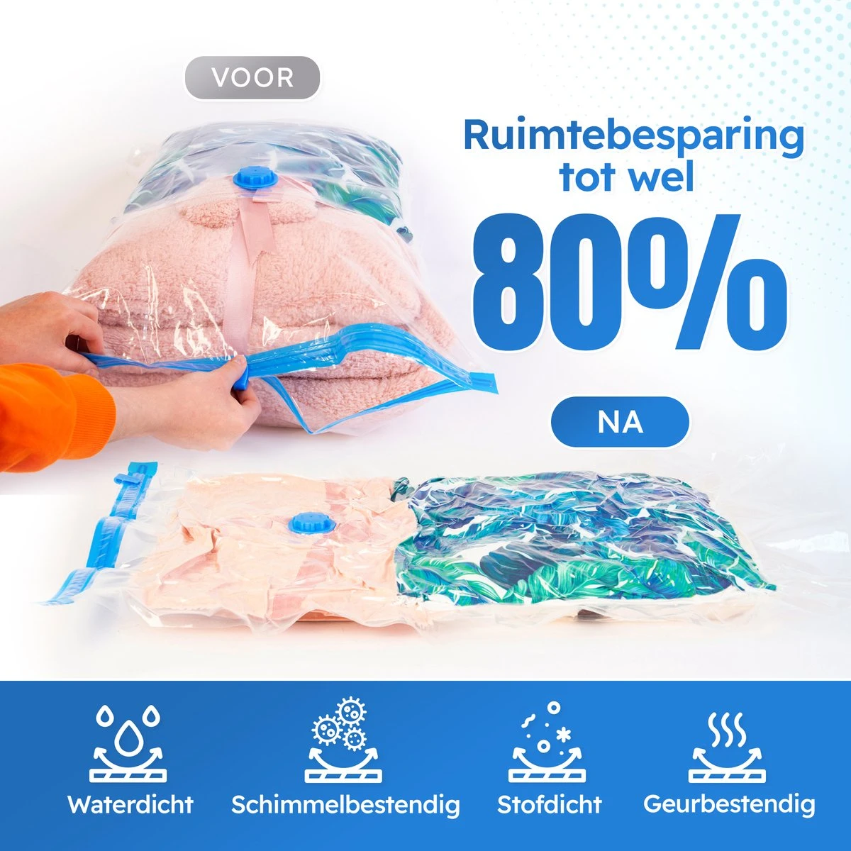 Textiel dient schoon en droog te zijn voor gebruik. Het is raadzaam om een stofzuiger of een luchtbedpomp met vacuรผm zuigfunctie te gebruiken voor de XL opbergzakken aangezien dit een stuk sneller gaat.