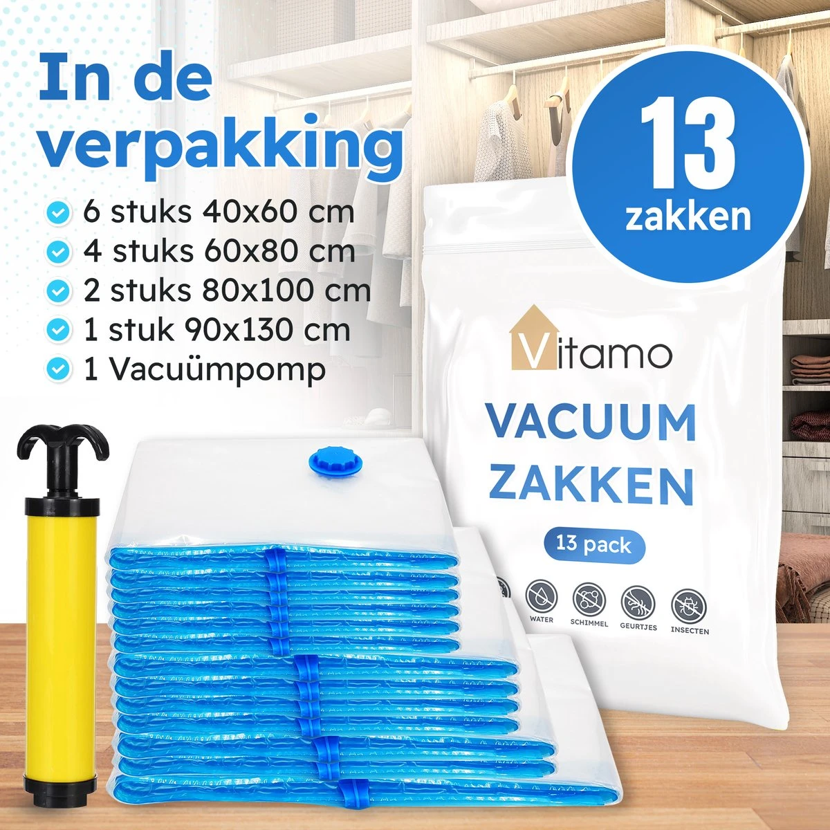 Met deze set van 13 stuks premium vacuรผm opbergzakken bespaar je enorm veel ruimte en berg je je textiel luchtdicht en waterdicht op. Of je nu ruimte wilt besparen in de koffer of meer ruimte wilt in je kledingkast, de scheurbestendige vacuรผmzakken van VITAMO zijn de oplossing. Bespaar tijd door het turbo-ventiel en berg je kleding, kussens en dekens op. Of verlaag je luchtbagagekosten met deze zakken. De XL zakken zijn geschikt voor een grote hoeveelheid kleding, dekbedden, knuffels, etc. De kleinere afmetingen zijn perfect voor bijvoorbeeld wat truien en handdoeken.