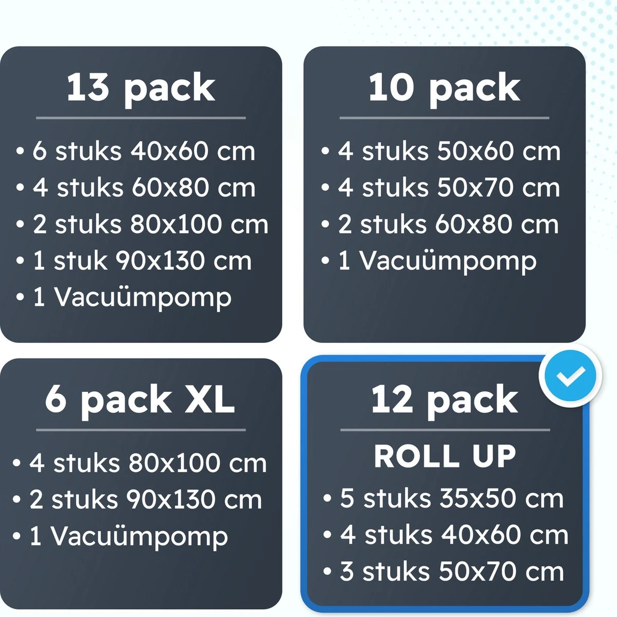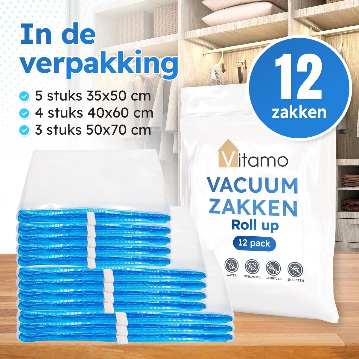 Deze set van 12 stuks oprolbare vacuรผm opbergzakken is ideaal voor het veilig luchtdicht en waterdicht opbergen van je textielgoed als je geen stofzuiger of handpomp tot je beschikking hebt. Je kan toch aardig wat lucht eruit drukken door de vacuรผmzakken op te rollen en te persen. Zo kan je veel meer bagage meenemen in je koffer of rugzak. De herbruikbare vacuรผmzakken in 3 handige maten zorgen ervoor dat je je textiel extra compact en beschermd kunt opbergen.