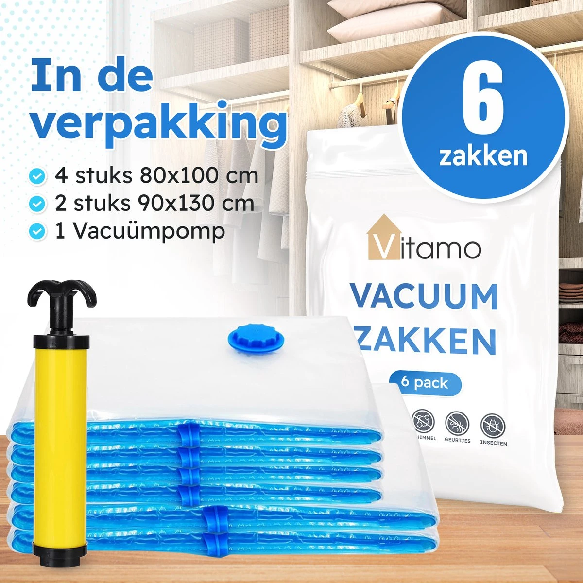 Deze set van 6 stuks XL vacuรผm opbergzakken is ideaal voor het veilig luchtdicht en waterdicht opbergen van je textielgoed. De herbruikbare vacuรผmzakken in 2 handige XL maten zorgen ervoor dat je je textiel extra compact en beschermd kunt opbergen.
