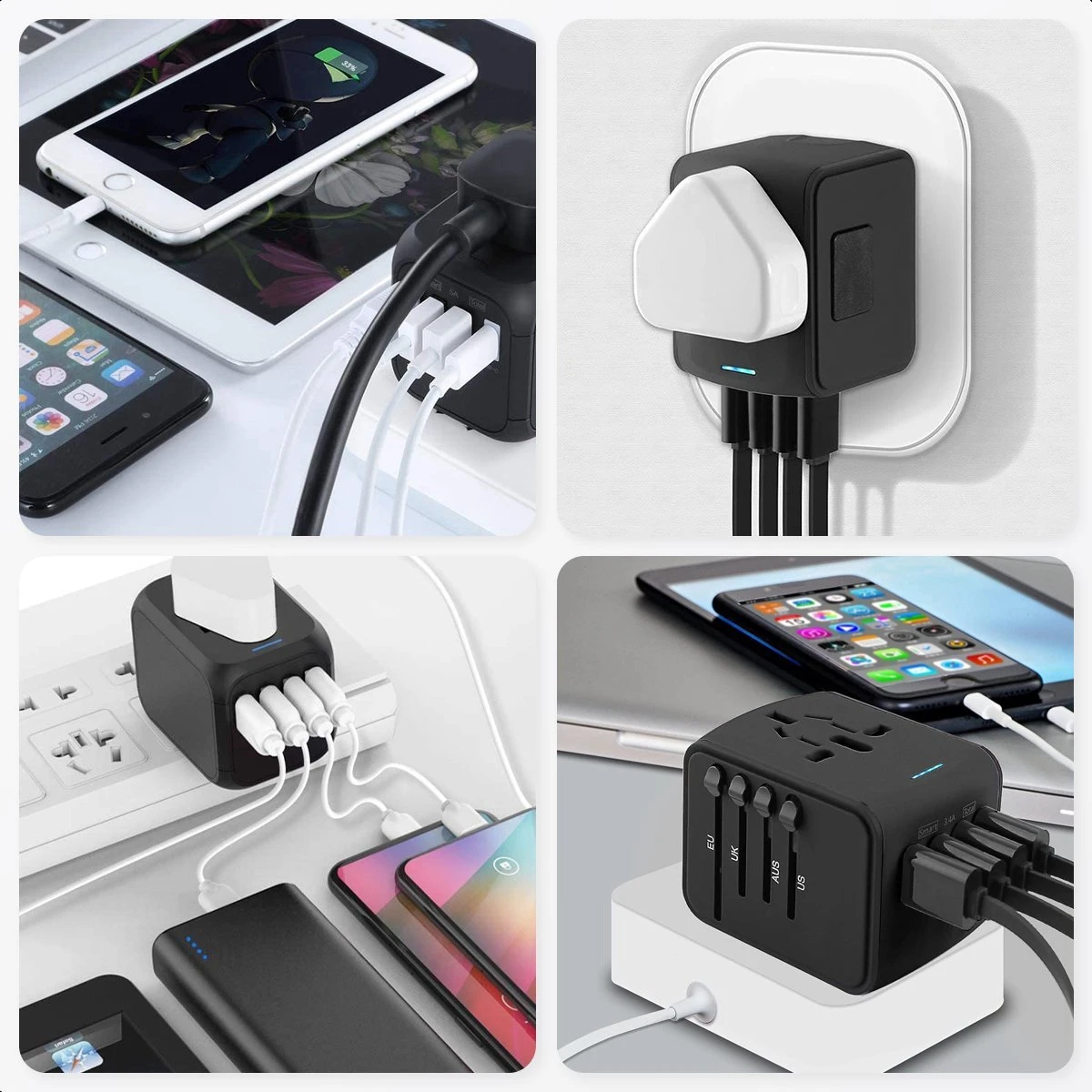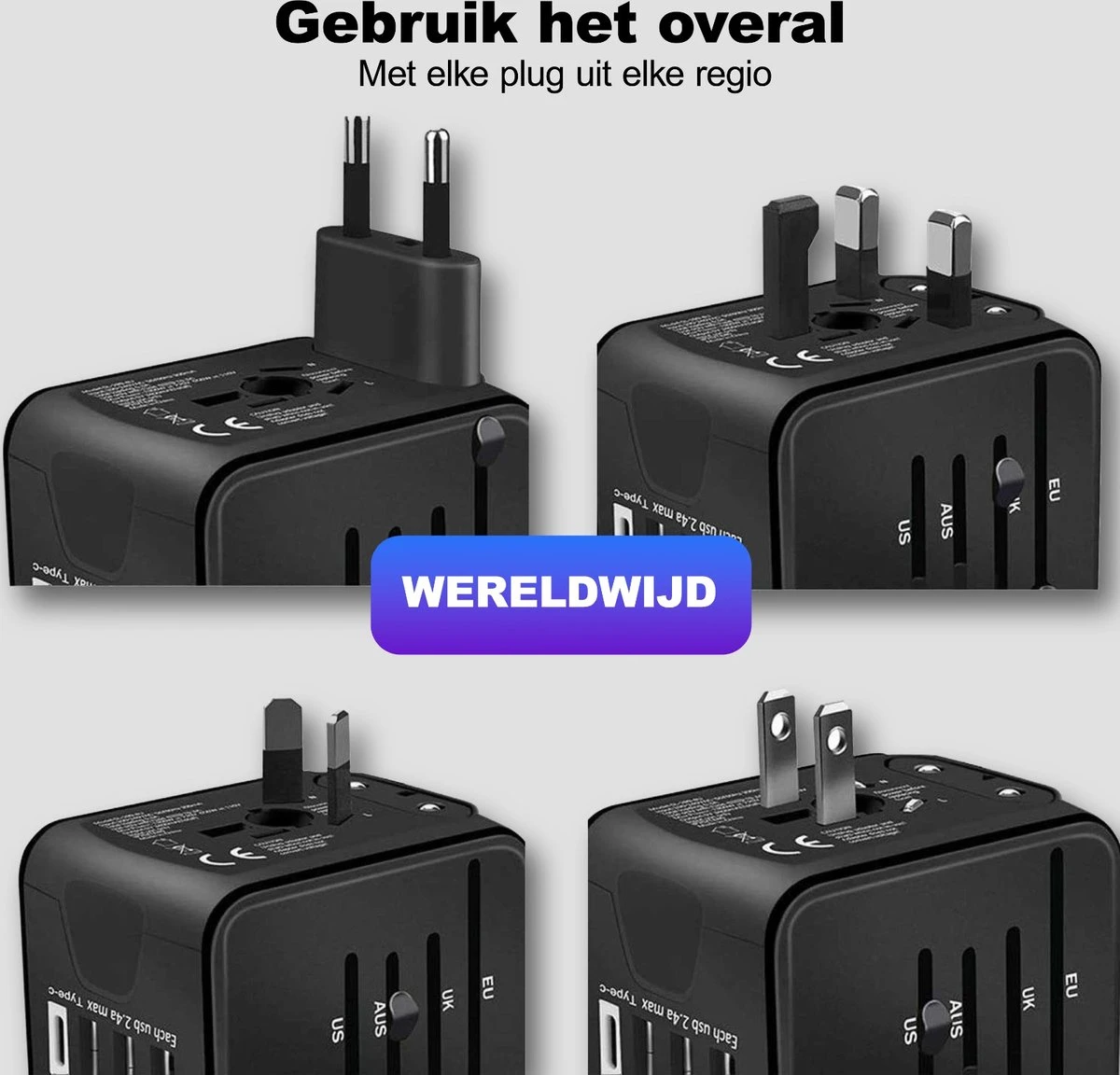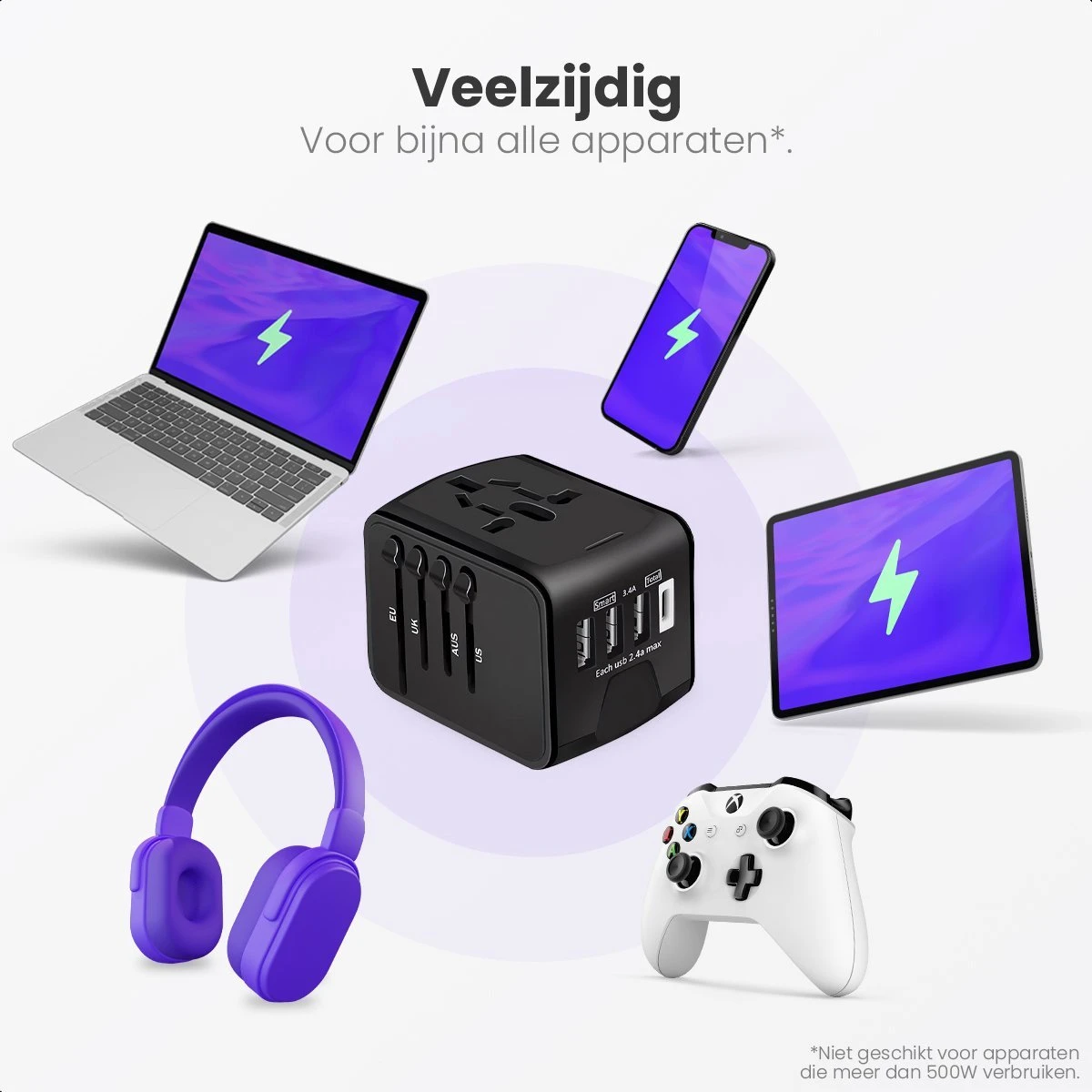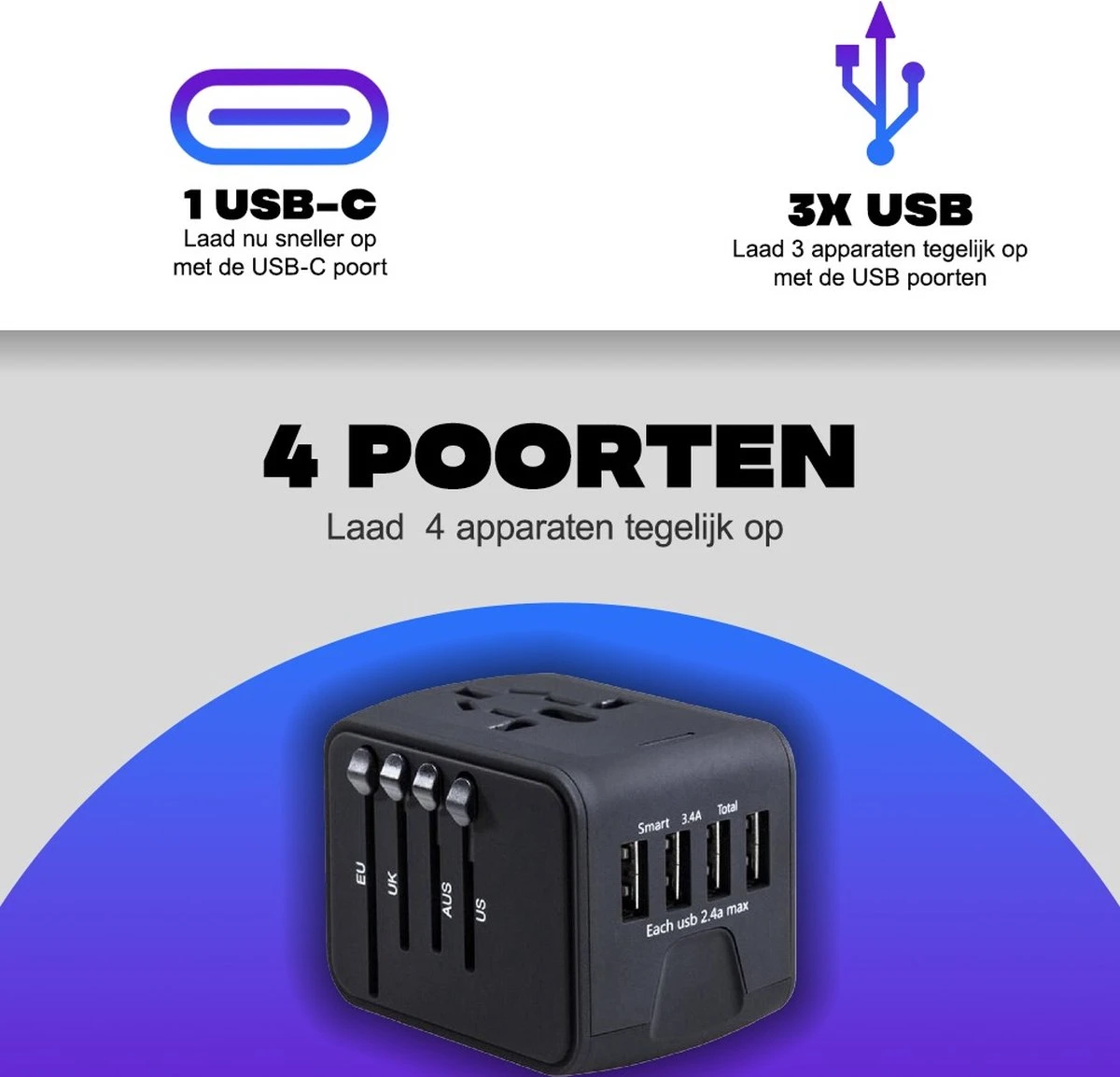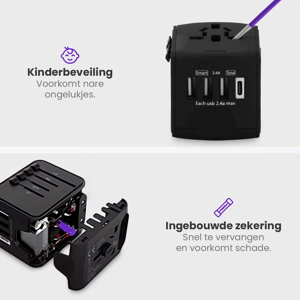 Een groot voordeel van deze universele reisadapter is dat je je toestel direct van stroom kunt voorzien. Drie van de USB-poorten hebben een vermogen van 2, ampรจre en de vierde is een snellaadpoort. Dat wil zeggen, minimale laadtijd, maximale prestaties.