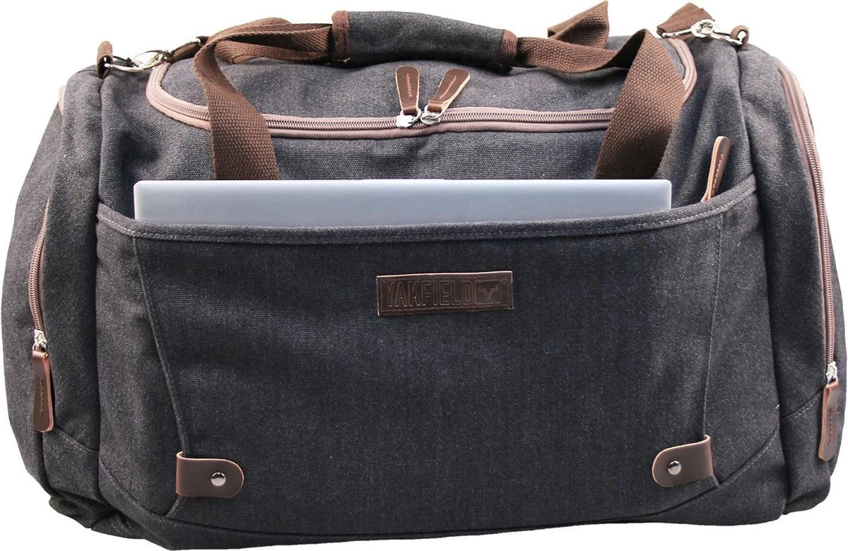 Reistas Mikkelsen van Yakfield is uitgevoerd in antracietgrijs, ook wel vintage zwart genaamd. Donkerbruine contrast accenten geven deze tas de stoere uitstraling die je zocht.