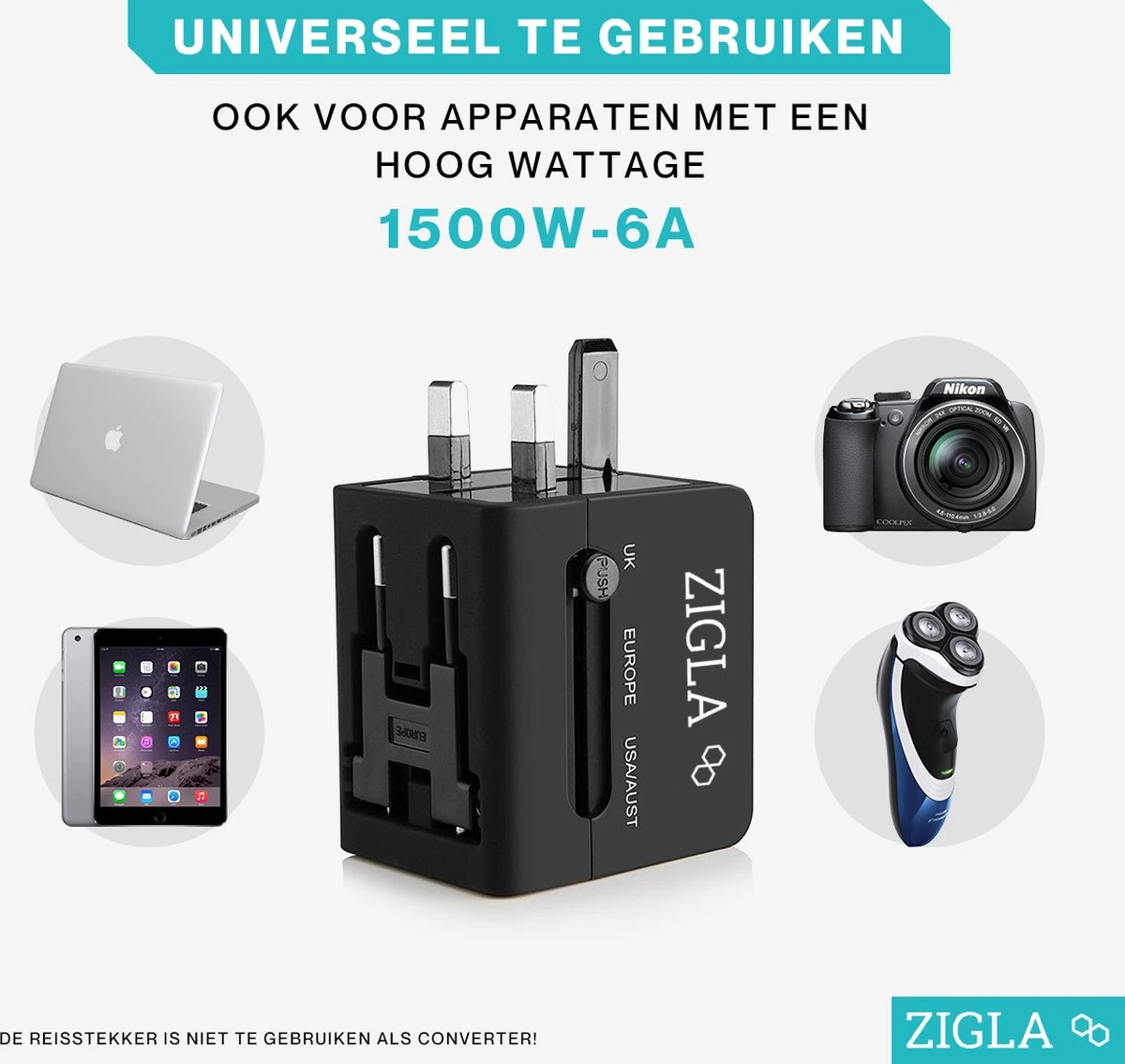 Met deze wereldstekker kun je tevens apparaten met een hoog vermogen tot 1500 watt (AC 100-240V) gebruiken. Denk bijvoorbeeld aan een scheerapparaat, föhn of reisstrijkijzer. Let wel op, de reisstekker is niet te gebruiken als converter!